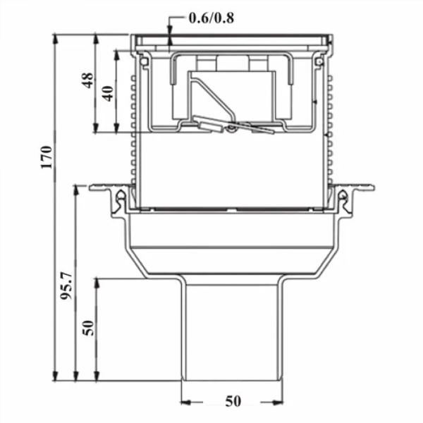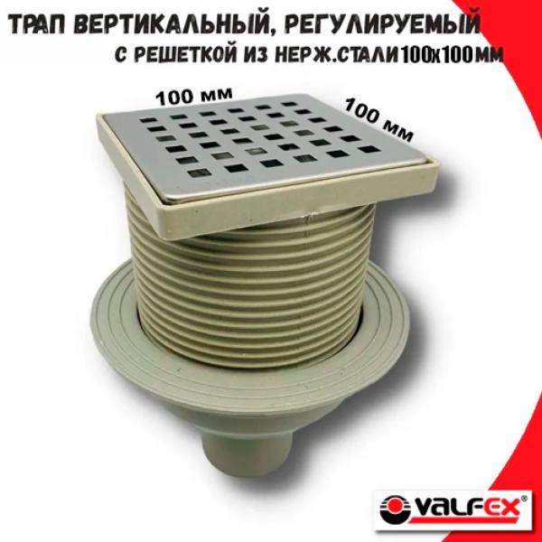 Трап вертикальный 100x100 мм выпуск Ø 50 мм, регулируемый, комбинированный затвор, решётка из нержавеющей стали VALFEX (19)