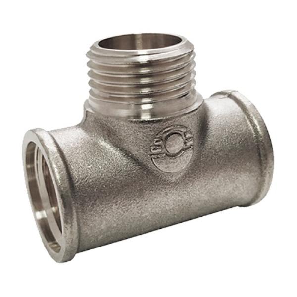 Латунный трехсторонний фитинг, равнопроходной, соединяющий три отрезка трубы, один из которых устанавливается перпендикулярно двум другим. Резьба - внутренняя/наружная/внутренняя цилиндрическая трубная по ГОСТу 6357-81. Гарантия: 10 лет