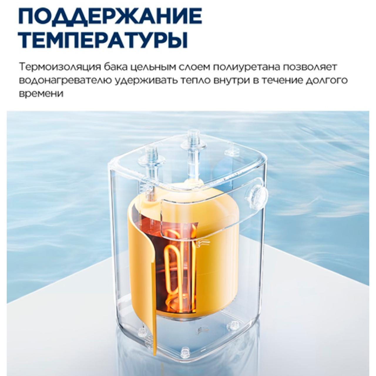 Внутренний бак термоизолирован цельным слоем полиуретана, благодаря чему водонагреватель удерживает тепло внутри в течение долгого времени.