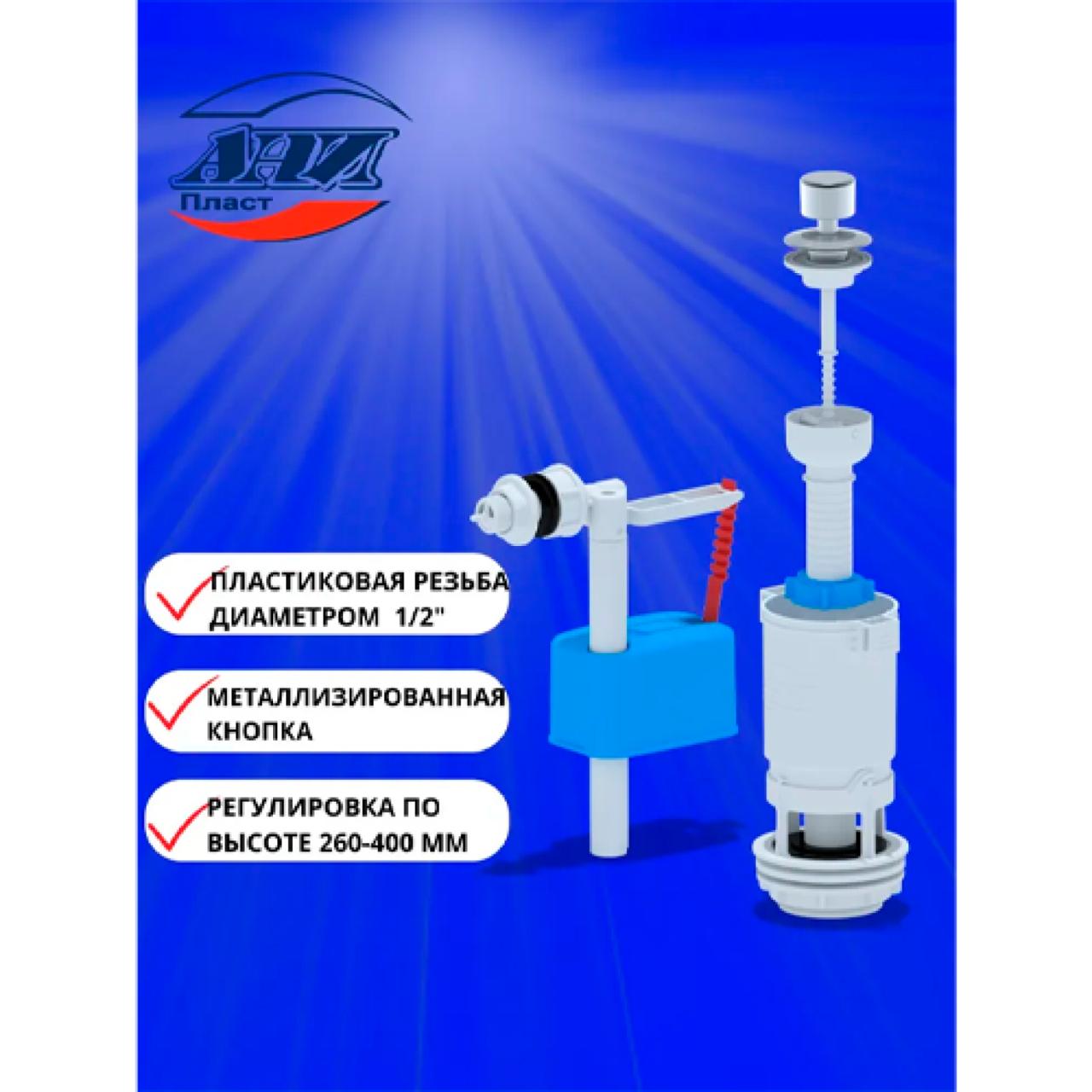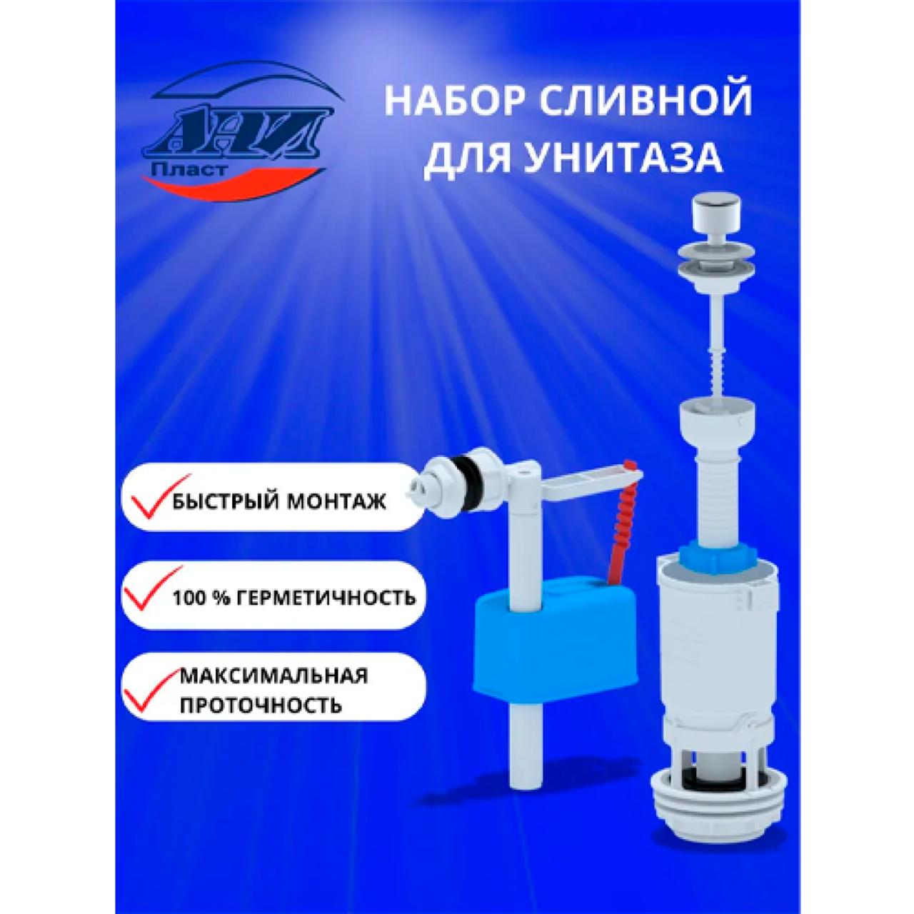 Набор для бачка унитаза АНИ Пласт WC4050M эконом — это надежное и практичное решение для организации эффективной работы сливной системы. Комплект включает наливной механизм с верхней боковой подводкой диаметром 1/2 дюйма и сливной механизм с белой ручкой штокового типа. Арматура изготовлена из высококачественного пластика, обеспечивающего длительный срок службы. Гарантия: 2 года