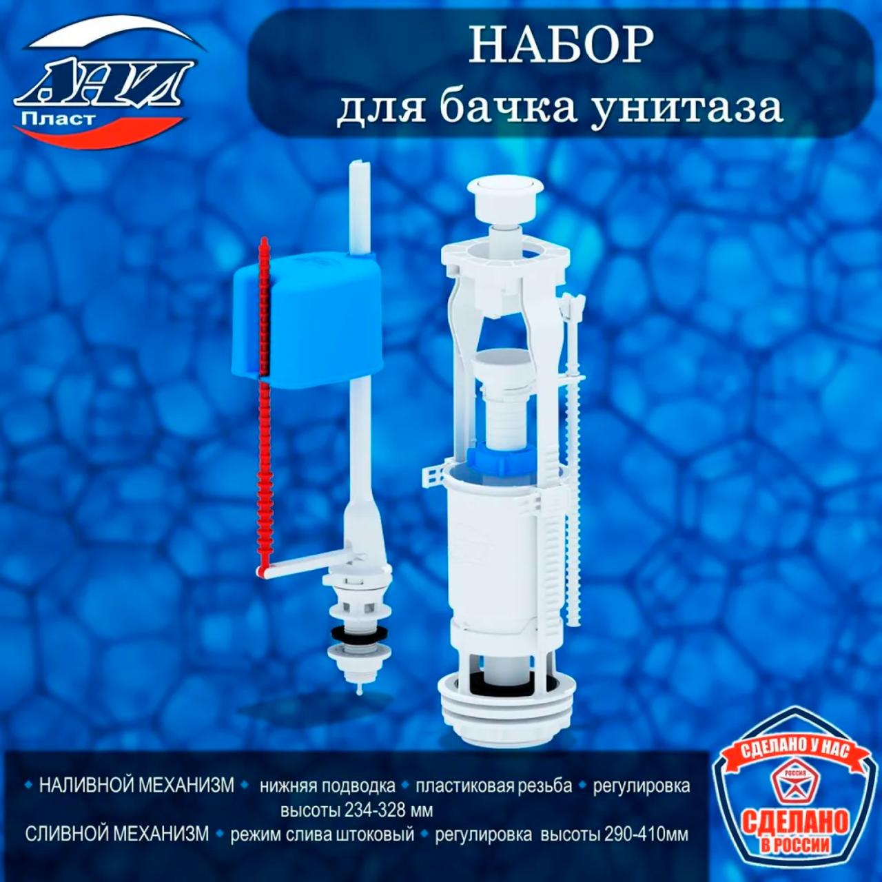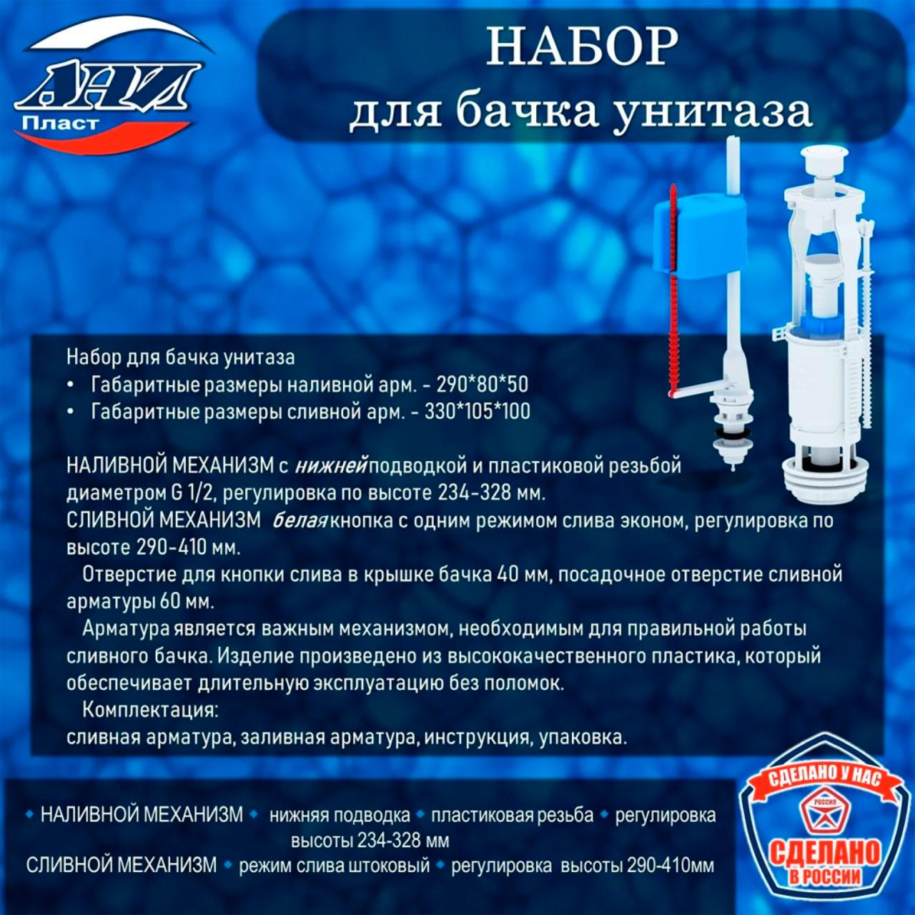 Набор АНИ Пласт WC6550 — это продуманное решение для монтажа и замены арматуры бачка унитаза, сочетающее удобство регулировки, экономичность и надежность в ежедневной эксплуатации.